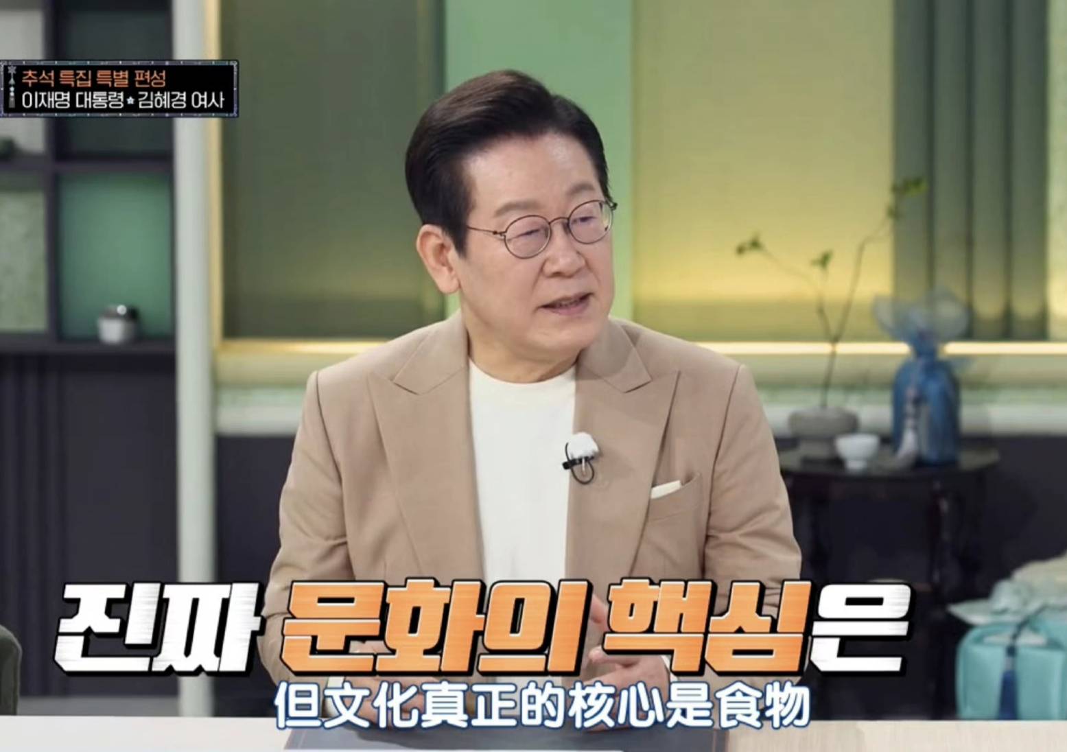 节目恰逢秋夕节時点,他们谈到了韩国资源有限的现实,但由此而来的文化却成为国家的重要资产。李在明在现场强调,文化事业中韩团和电视剧固然重要,但文化的真正核心是食物。若没有美食的支撑,其他文化现象也难以成为持久的、可持续发展的力量。美食产业对韩国的整体崛起具有明显的正向推动作用,是可以持续放大的经济与国家软实力的源头之一。