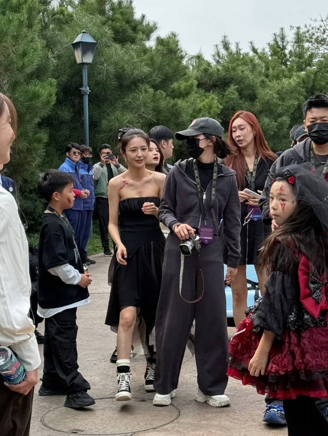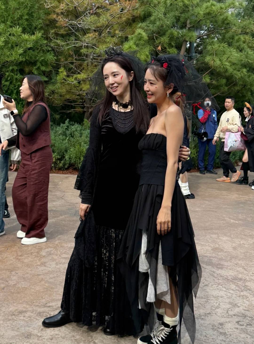 董璇则是一身黑色鱼尾长裙,大概是在扮演“女巫”之类的角色。