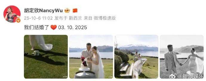 10月6日,女演员胡定欣晒出婚纱照官宣结婚,“我们结婚了