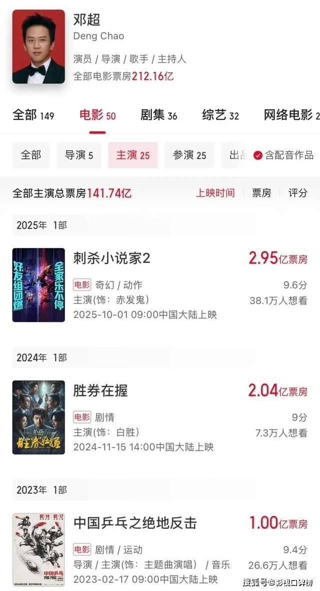 2023年《中国乒乓》1亿、2024《胜券在握》1.26亿、《刺杀小说家2》假期内2.95亿。与其昔日随便烂片《分手大师》等动辄十几亿票房相比落差巨大,更与其生涯总票房212亿形成鲜明对比。很多人表示,这是由于他在综艺《哈哈哈哈哈》和《奔跑吧兄弟》固化其搞笑人设,观众看到其电影角色时总联想到节目中的嬉笑画面,导致严肃作品接受度降低,加上自导自演的强喜剧风格差强人意。未来,若邓超不能平衡综艺与演员身份,票房基本盘或进一步瓦解。