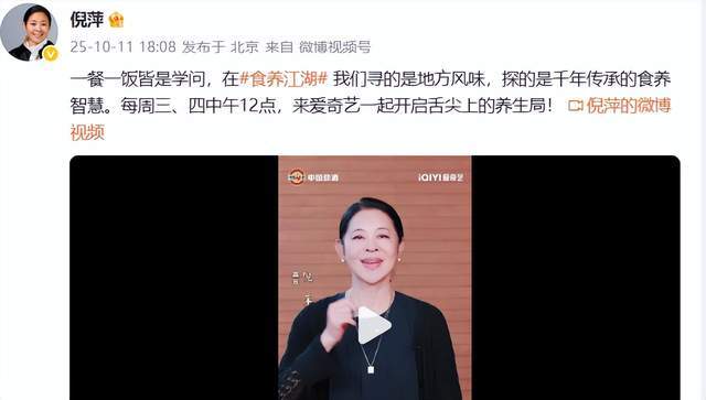 与此同时,主持人倪萍还发布了一则时长达00:17秒的短视频,该视频系主持人倪萍为全新真人秀综艺节目《食养江湖》录制的宣传片,下面就让我们一起来看看都有哪些值得关注的亮点之处: