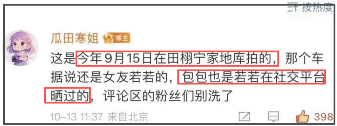 包括狗仔也亲自喊话那些洗白的粉丝,称这条视频早在一个月前,在田栩宁家地库拍到的,据说车还是若若的,而且这个包也是若若自己晒过的,粉丝在这疯狂狡辩简直就是无用功。