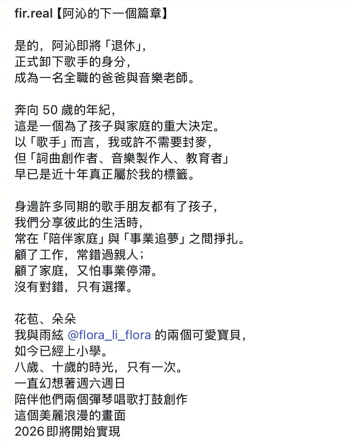 搜狐娱乐讯 13日,飞儿乐团前成员阿沁无预警宣布退圈,表示自己将正式卸下歌手身份,成为一名全职爸爸和音乐老师,“这不是隐退,因为一点都不伤感反而很雀跃,而是把舞台转向幸福与自由生活。”据悉,2015年他与小14岁的模特女友宣布订婚,育有两女,2024年他离开飞儿乐团。