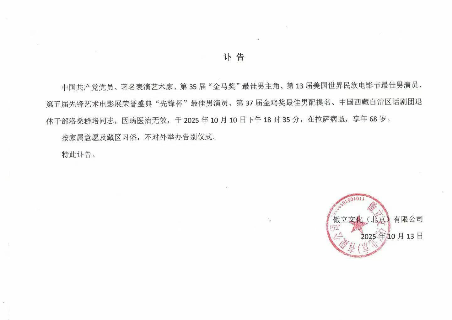 搜狐娱乐讯 10月13日,据讣告,藏族资深演员洛桑群培于10月10日在西藏拉萨病逝,享年68岁。凭借《天浴》获金马奖最佳男主角奖,凭借《雪豹》提名金鸡奖最佳男配角。