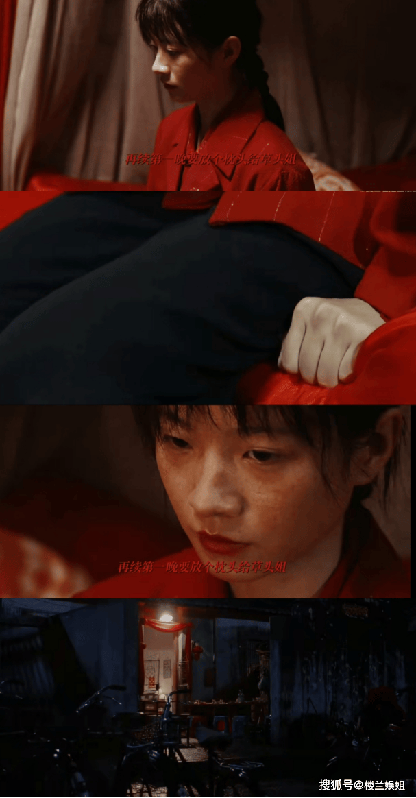吴细妹木然的脸上,没有半分喜悦和期待,只有被命运玩弄的麻木,黑漆漆的夜和挂在门上的红绸,充满着中式恐怖的诡异。