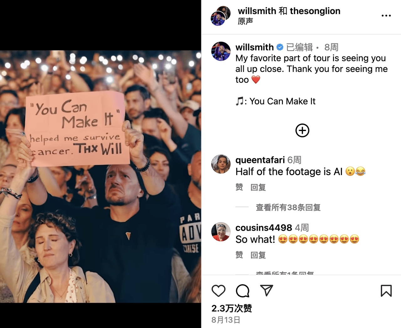 近期知名影星 Will Smith 就卷入了类似的争议。他在社交媒体上分享的一段演唱会宣传视频中,观众席里出现了扭曲模糊的脸孔和奇怪动作,被网友指责疑似责合成观众(即用 AI 生成粉丝的画面)。
