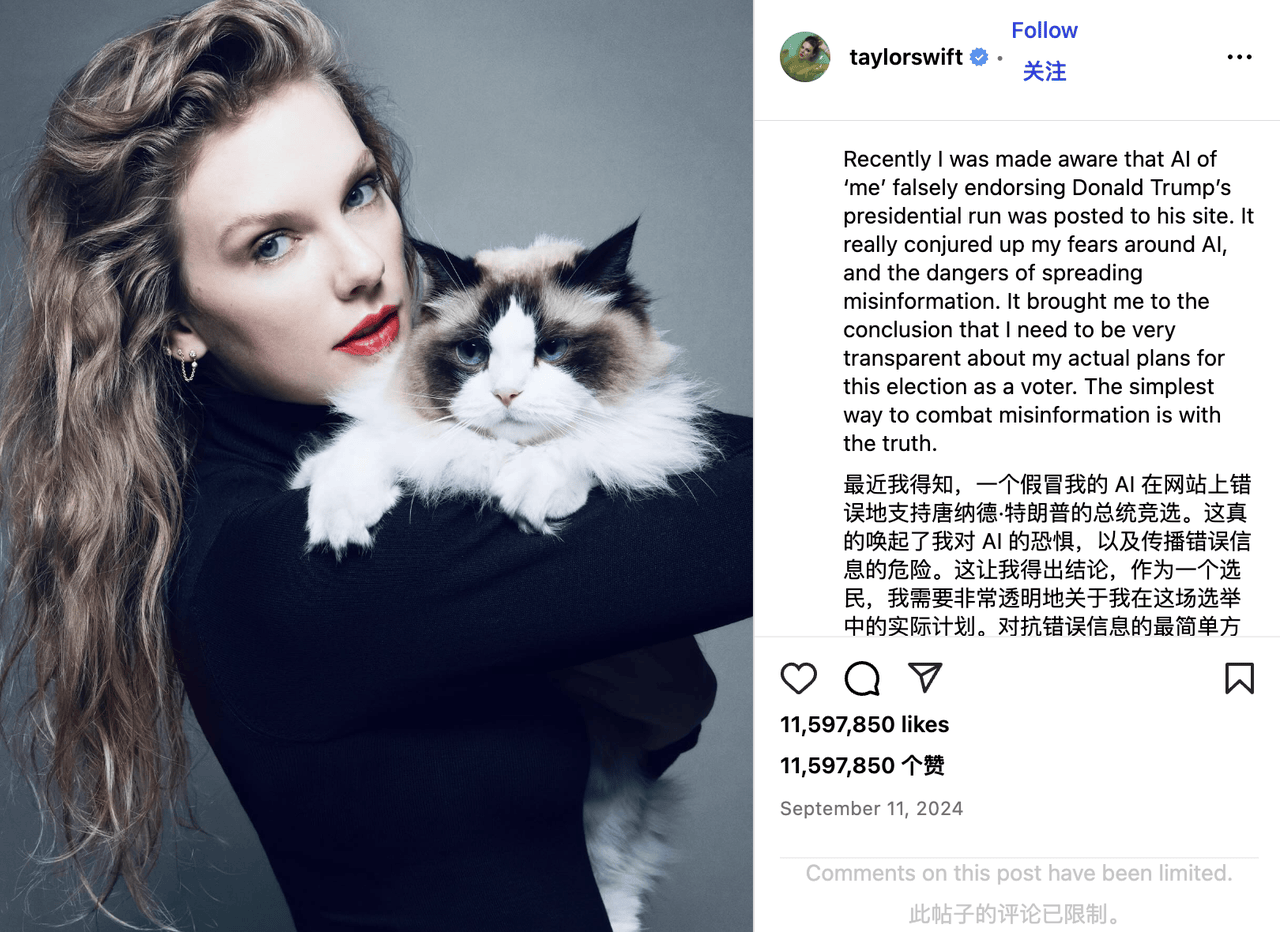 除了色情滥用,霉霉的形象还被用于制造政治虚假信息——比如伪造她给特朗普「背书」的视频 。在回应这一事件时,霉霉发表了她对该技术最直接、最公开的谴责。
