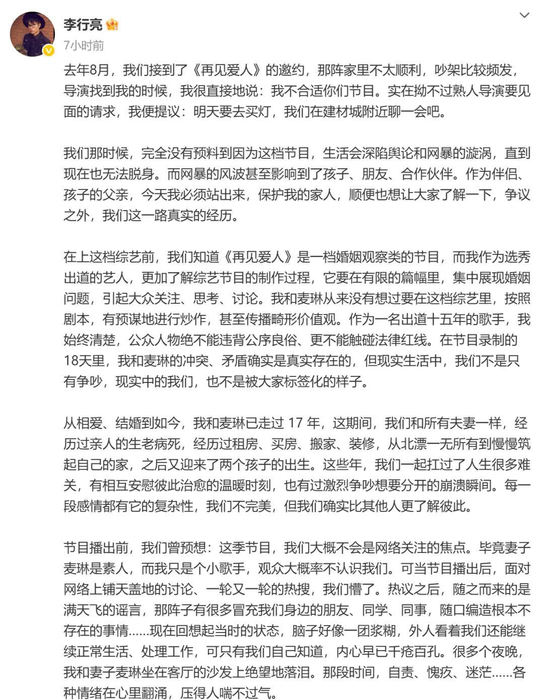 李行亮于2025年10月13日发布长文维权,控诉因参与综艺《再见爱人4》后长期遭遇网络暴力及有组织的恶意举报,其家庭、事业均受严重干扰。