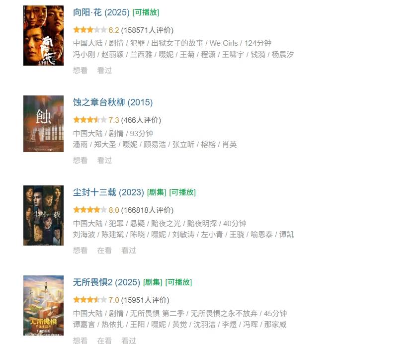 从影 15 年来,啜妮出演了 40 多部影视作品,其中 8 部主演剧有 7 部评分超过 7.0。