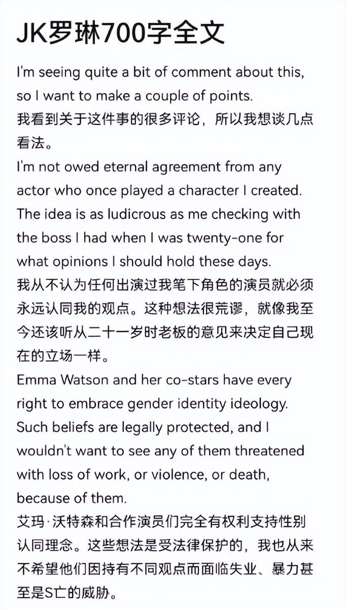 在艾玛回应罗琳之后,罗琳怒发700字长文进行了回击。