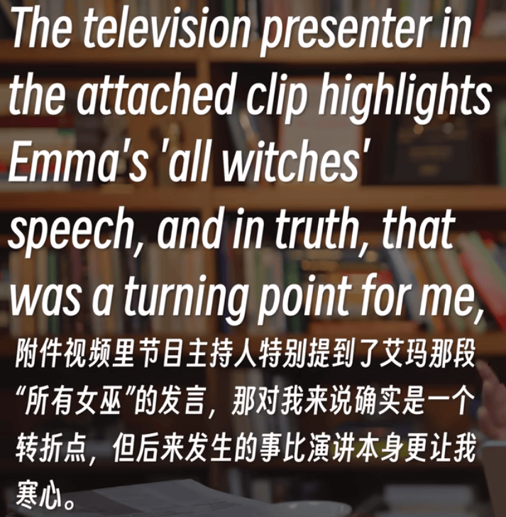 首先,JK 罗琳说如果艾玛做的不是如此,当面一套背后一套她也不会说这些大实话,和她提到的她经历过贫困的生活,了解女性的困境这一点完全契合,因为她不想伤害任何一名女性。