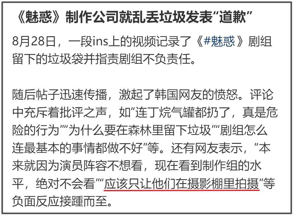 而且《魅惑》剧组在自己本土的风评就非常不好,剧方曾在森林拍摄时乱扔垃圾,造成环境污染,甚至连气罐都随意丢弃,又是在易燃地区,很容易造成危险,遭到韩国网友痛骂。甚至直言“应该只让他们在摄影棚里拍摄”。