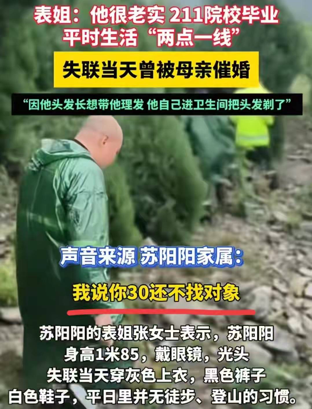 家人朋友进山里找他,因为没有手机、一直都联系不到,直到过去了9天,才有救援人员找到了他。不幸的是,找到苏阳阳的时候,他已经没有生命体征了。