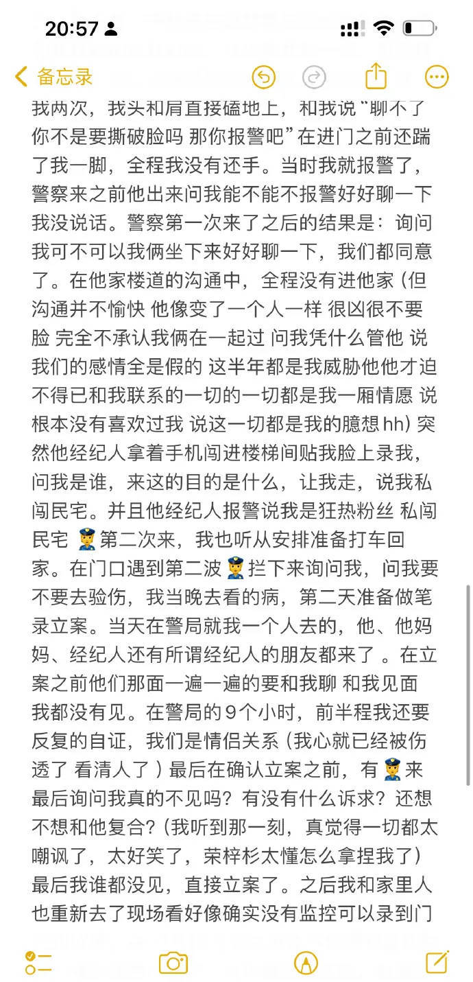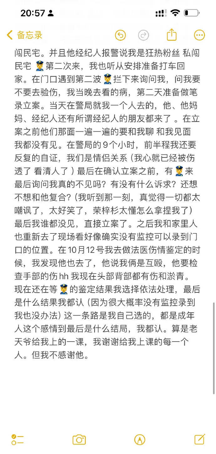 10月15日,演员李禹熹在社交平台发长文称荣梓杉出轨打人引发热议。她表示需要男方的道歉。文中,她阐述了自己与荣梓杉两人恋爱,恋爱三个月后开始冷暴力,恋爱存续期暧昧多名女生。她因为荣梓杉冷暴力一度确诊中度焦虑和抑郁。此外,还描述了荣梓杉对她动手的情况。