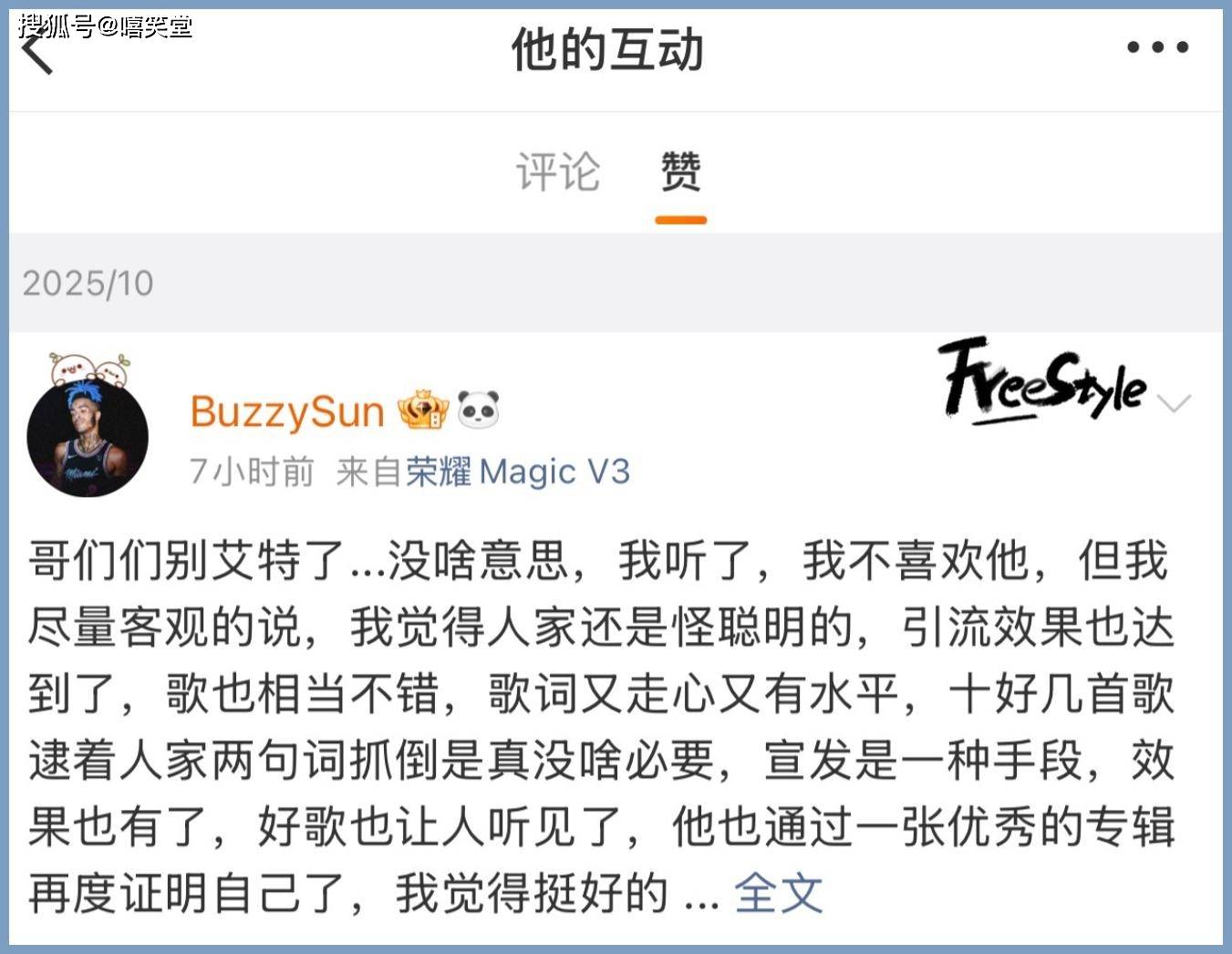 “我不喜欢他,但我尽量客观的说,我觉得人家还是怪聪明的,引流效果也达到了,歌也相当不错,歌词又走心又有水平,十好几首歌逮着人家两句词抓倒是真没啥必要,宣发是一种手段,效果也有了,好歌也让人听见了,他也通过一张优秀的专辑再度证明自己了,我觉得挺好的,不得不说这是非常聪明的做法,我个人甚至是确实有点佩服了,讲真话,他能走的高不奇怪”