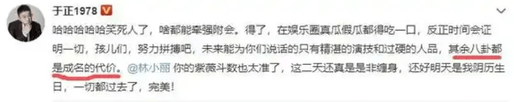 粉丝怒斥于正撒谎骗粉丝。于正也不装,摊牌了,说他俩已经谈了七年,就骗你怎么了。