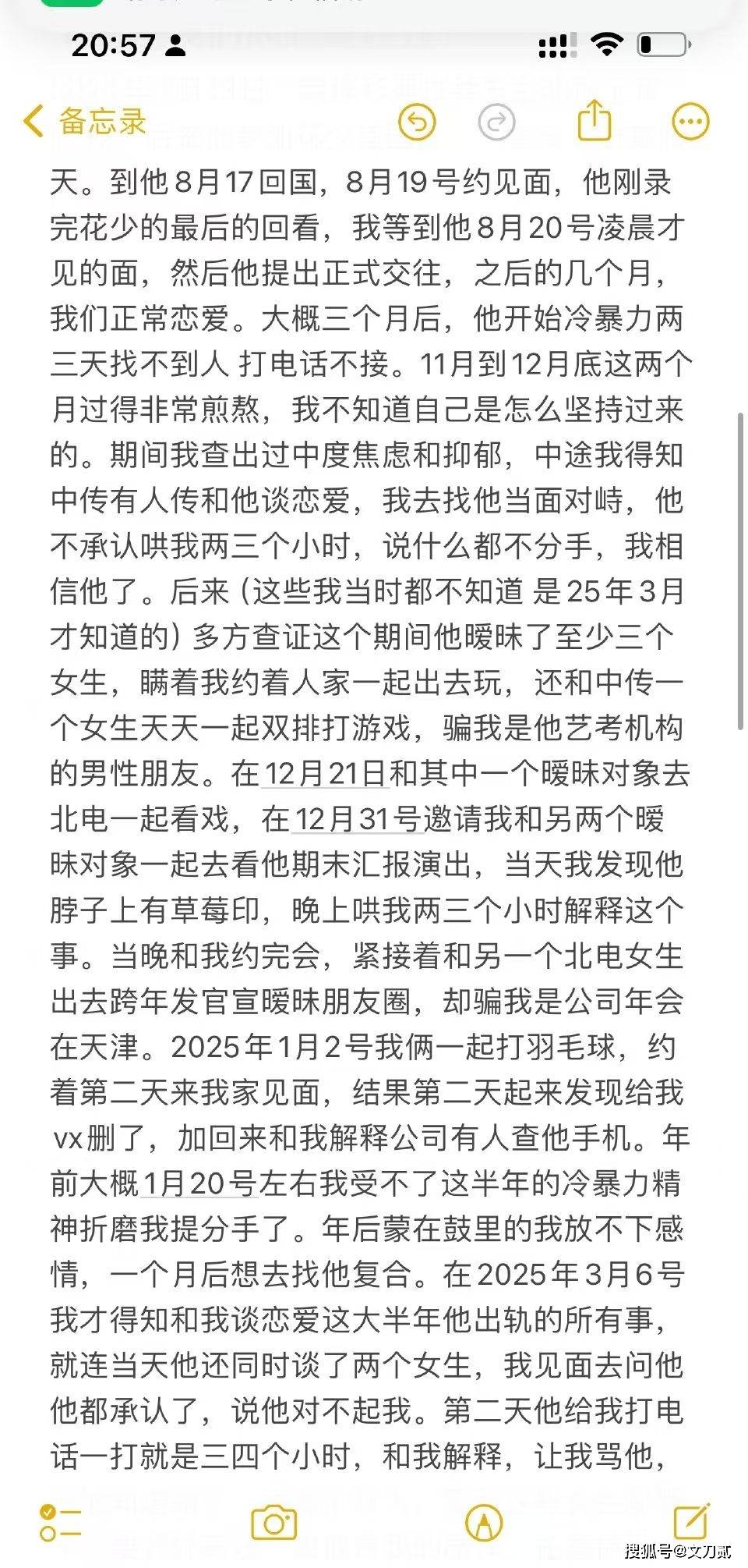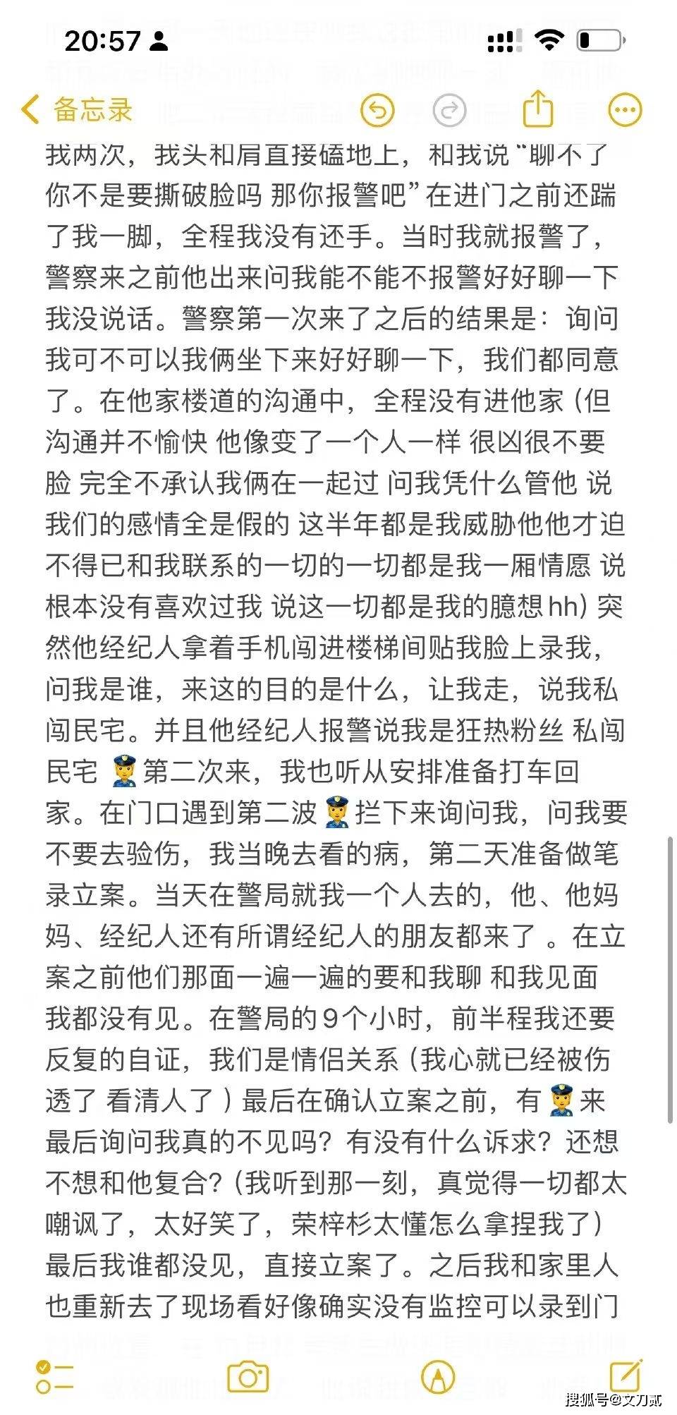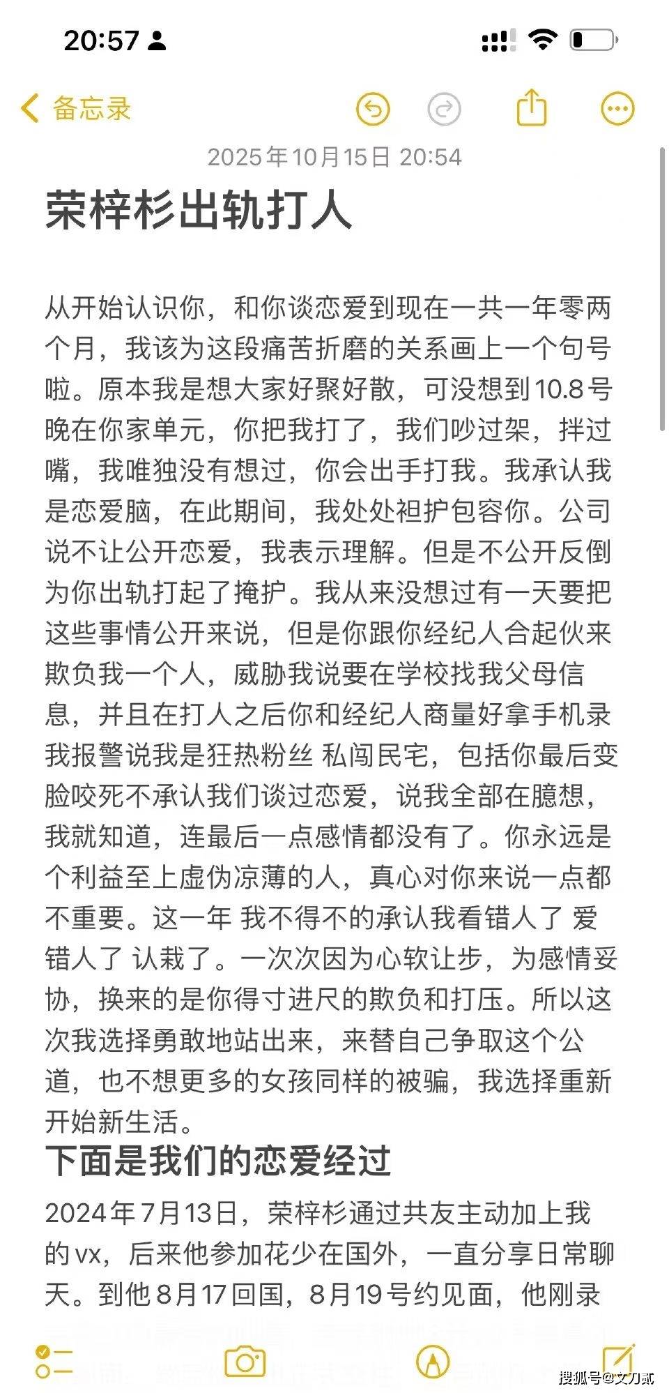 李禹熹发小作文自爆与荣梓衫于2024年8月确立了恋爱关系,但是仅仅恋爱三个月后,男方就过了热恋期开始对她玩冷暴力,甚至在女方上门讨要说法时,还遭到荣梓衫的拳脚相加,到底是荣梓衫荧幕前后两副面孔,还是李禹熹爱而不得自导自演“被家暴”戏码蹭热度?