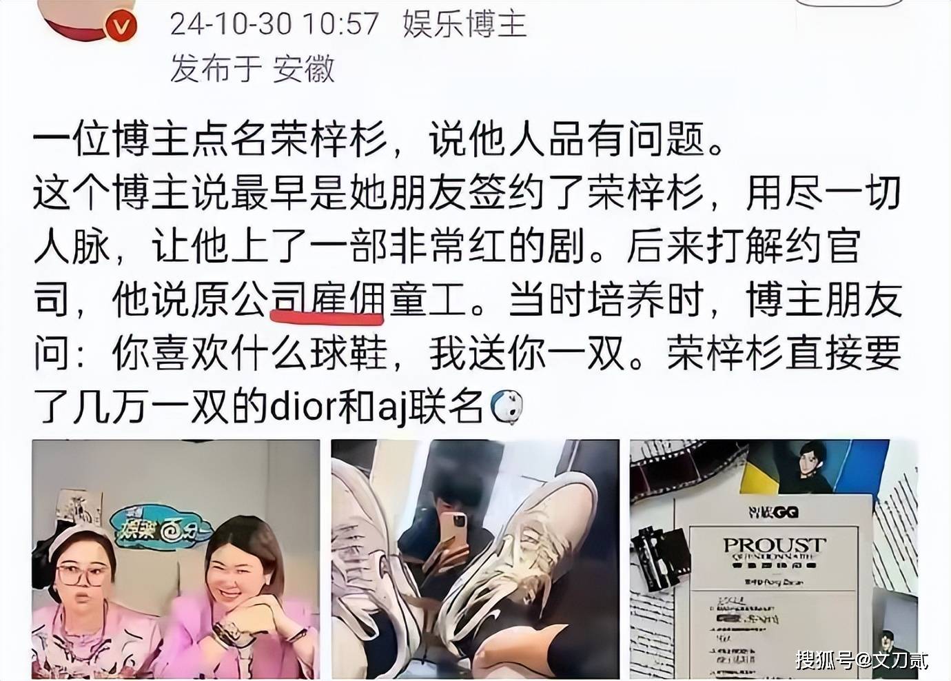 有博主公开表示荣梓衫信奉利益至上的处事原则,在参演《隐秘的角落》爆火后,背靠陈思诚这棵大树与前经纪人解约不算,还转脸反诉前经纪人雇佣童工,并向前经纪人索要价值7万元的球鞋,一手渣牌打的震天响。