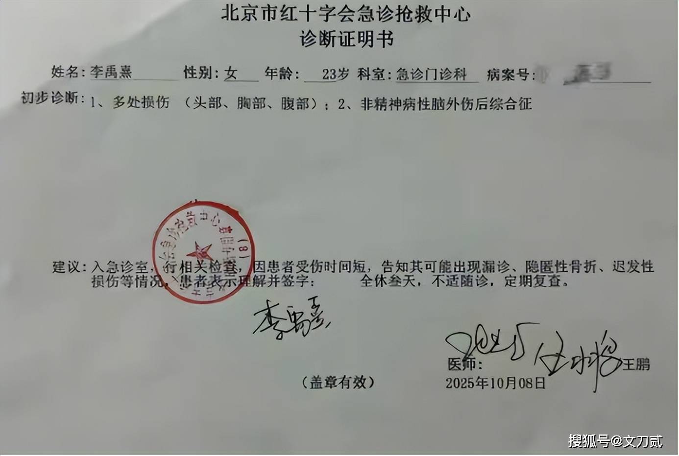 好在在警察的提醒下,李禹熹前往北京红十字会急诊抢救中心验伤,这才留下了“殴打案”的重要证据。