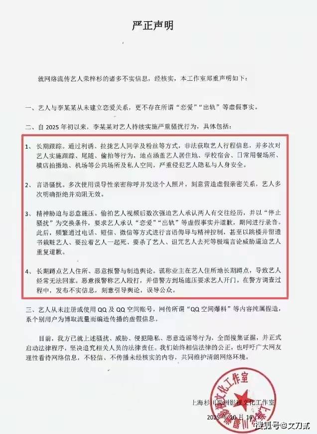 声明中一再表示,荣梓衫从未与李禹熹恋爱,而出轨更是子虚乌有,同时工作室还指出,自从2025年初,李禹熹就曾多次对荣梓衫进行跟踪、偷拍、精神胁迫等骚扰。