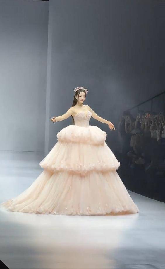 之后她又穿着一套粉色蛋糕裙礼服,单独走秀,边走边表演“芭蕾舞”,简单的直发,加上一个粉色王冠,让她很有公主感。