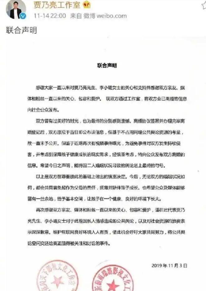 2019年11月4日,贾乃亮和李小璐各自发布了离婚的声明,结束了这段婚姻,才算是给这场风波暂时画上了句号。