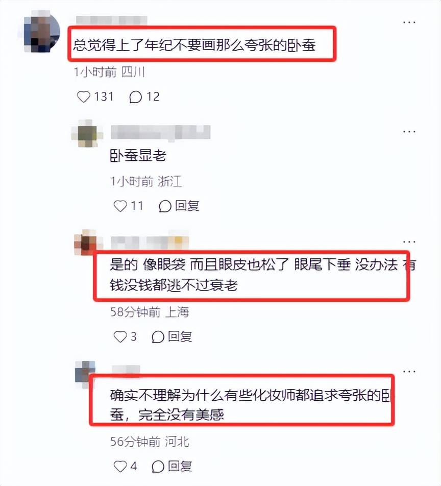 尤其是她的眼部,卧蚕画得过大了,整个眼睛比例明显不协调,且让她的人看上去疲惫又显老。