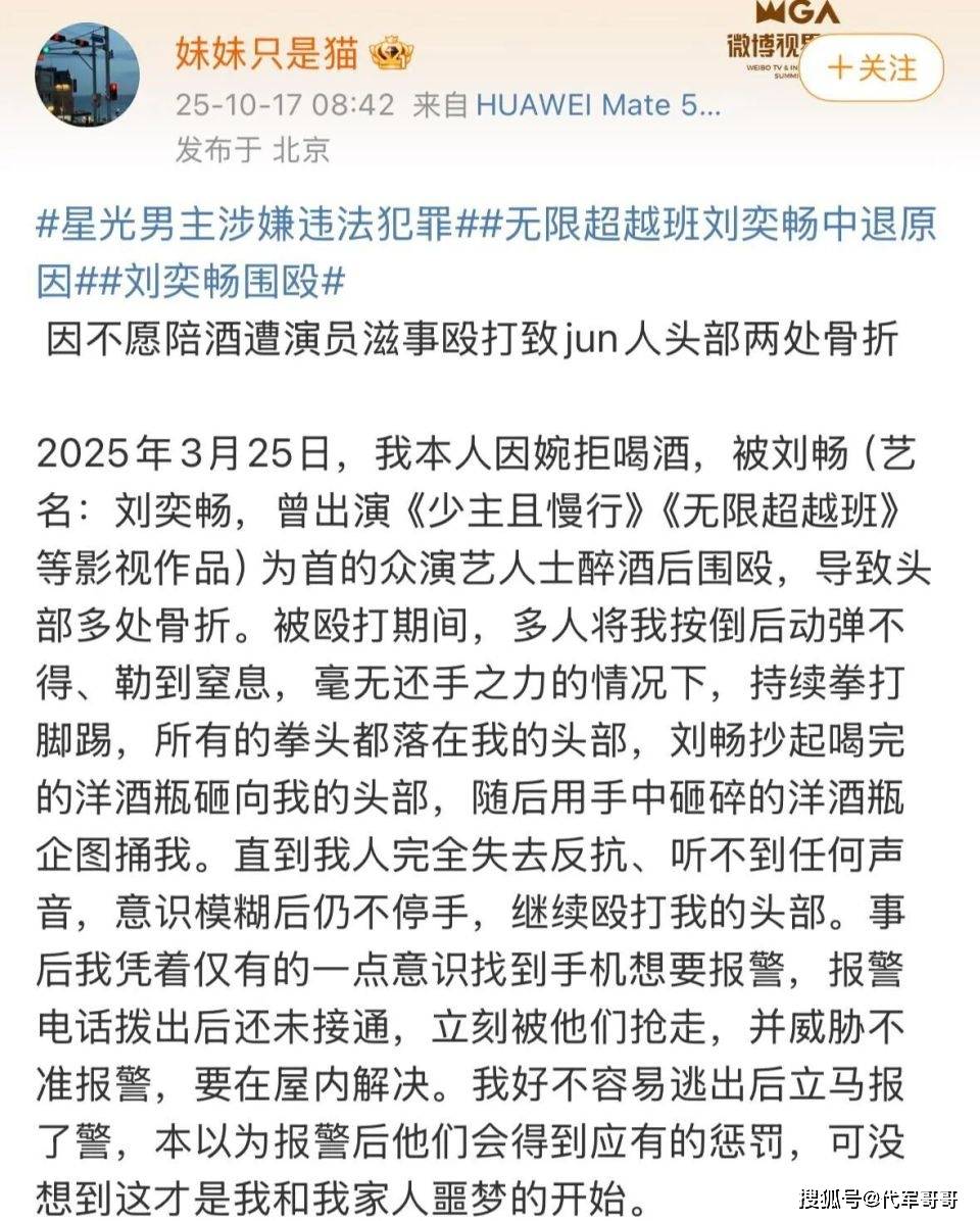 2025 年 3 月 25 日的一场酒局,成为演员刘奕畅演艺生涯的断崖式转折点。据自称军人身份的受害者 “妹妹只是猫” 公开控诉,他因婉拒陪酒要求,立即遭到以刘奕畅(本名刘畅)为首的多名演艺人士围殴。