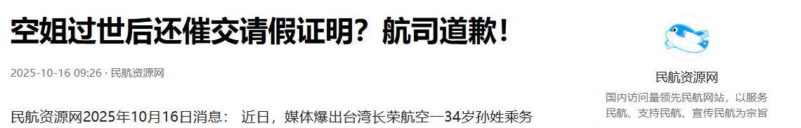 民航资源网2025-10-16:空姐过世后还催交请假证明?航司道歉!