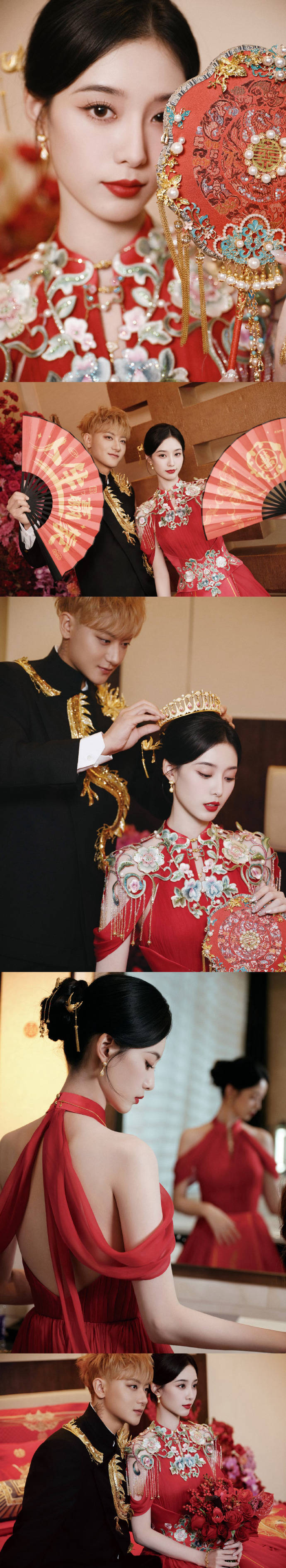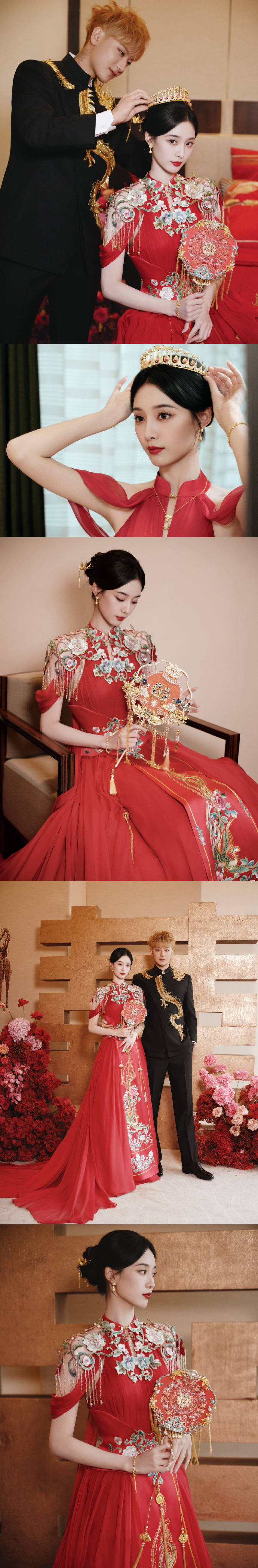 徐艺洋身穿红色秀禾,两人非常恩爱。