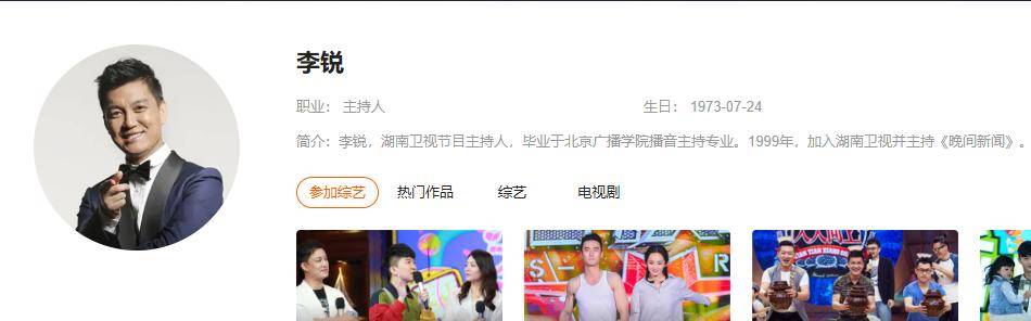公开资料显示,李锐,1973年7月24日出生于吉林省长春市,祖籍山东省莱阳市,湖南卫视节目主持人,毕业于北京广播学院播音主持专业。此外,他还是汇天航空航天公司副总裁、合伙人,中国人形机器人公司优必选高级副总裁,大爱AI人工智能董事长,兼任小鹏汽车集团副总裁、湖南卫视商业中心副总监。