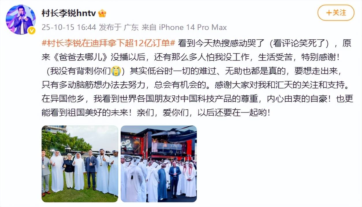 10月15日,李锐发文回应:“看到今天热搜感动哭了(看评论笑死了),原来《爸爸去哪儿》没播以后,还有那么多人怕我没工作,生活受苦,特别感谢!(我没有背刺你们)其实低谷时一切的难过、无助也都是真的,要想走出来,只有多动脑筋想办法去努力,总会有机会的。感谢大家对我和汇天的关注和支持。在异国他乡,我看到世界各国朋友对中国科技产品的尊重,内心由衷的自豪!也更能看到祖国美好的未来!亲们,爱你们,以后还要在一起哟!”