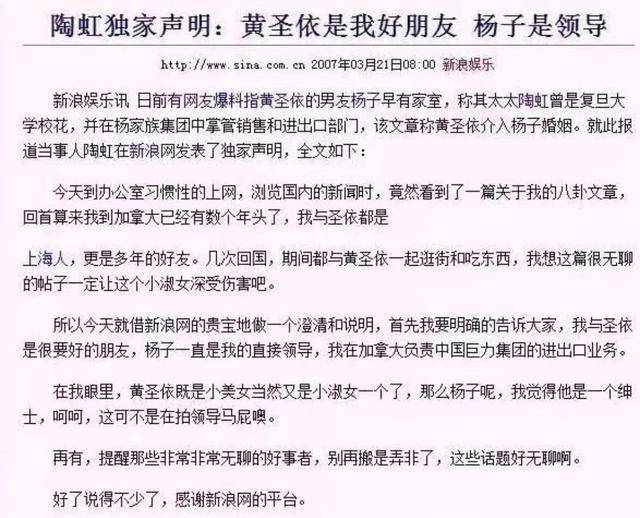 在黄圣依和杨子的婚姻闹得沸沸扬扬之际,陶虹也站了出来,