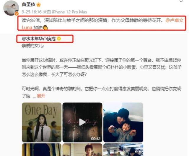 在这档节目播出前期,黄圣依在社交平台上发为支持水木年华卢庚戌的女儿卢卓文,