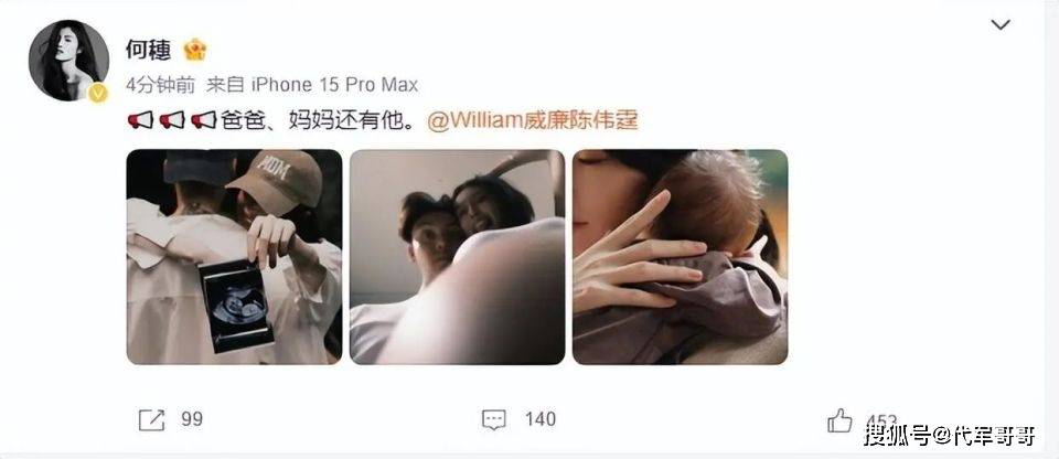 官宣照片里藏着满格幸福感:孕期的何穗身着浅色长裙依偎在陈伟霆肩头,超模气质中透着温柔;新生儿攥紧成人手指的特写画面治愈力十足;而两人怀抱宝宝的合影更让网友直呼 “基因太强大”。英皇娱乐、霍汶希等业内人士第一时间送上祝福,社交平台评论区 10 分钟内涌入十万条留言。