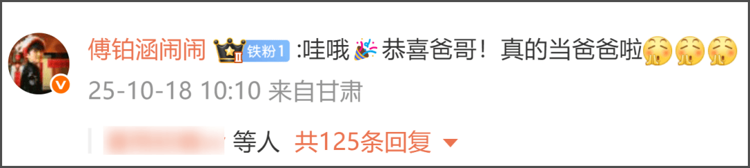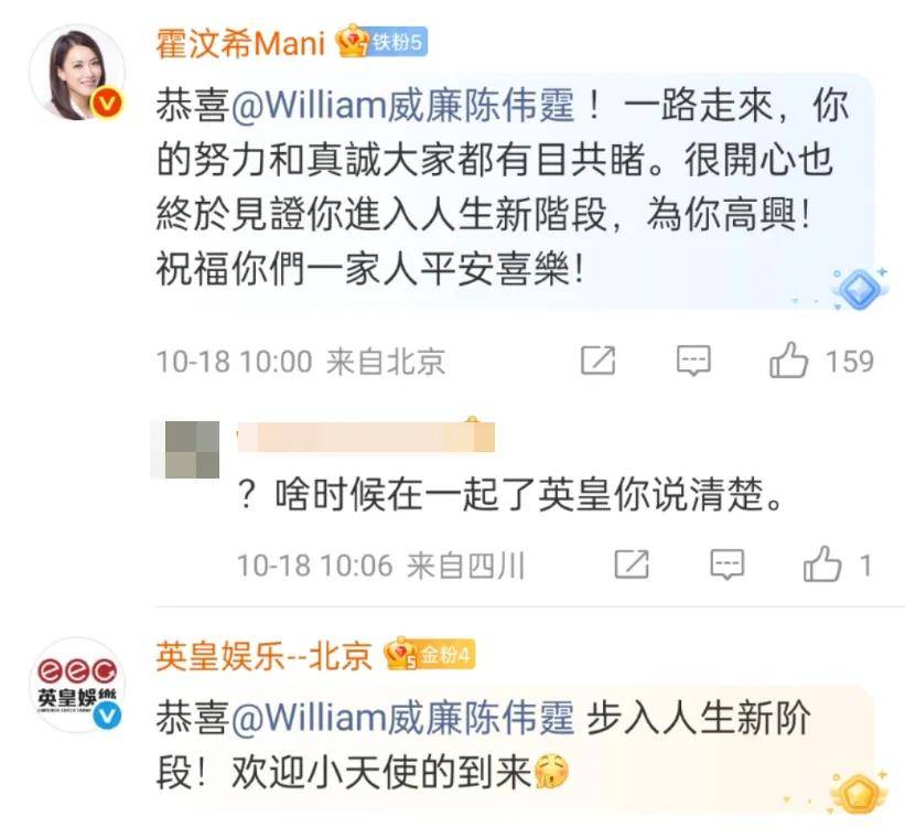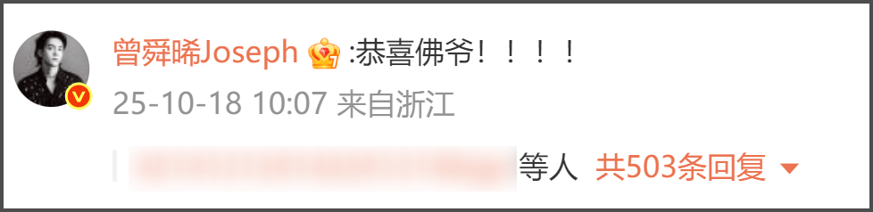 经纪人霍汶希也在陈伟霆评论区送上祝福,随后曾舜晞也在评论区发文称“恭喜佛爷!”,曾在《许我耀眼》中出演陈伟霆儿子的付铂涵也评论恭喜,“真的当爸爸啦”!