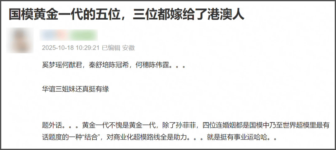不过网友发现也是很巧合,国模黄金一代的五位,三位都嫁给了港澳人,奚梦瑶嫁入何家豪门,秦舒培嫁给了陈冠希,如今何穗和陈伟霆也官宣生子,真是很有缘分了。值得一提的是,基本都是生娃但没办婚礼。