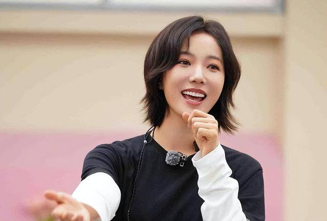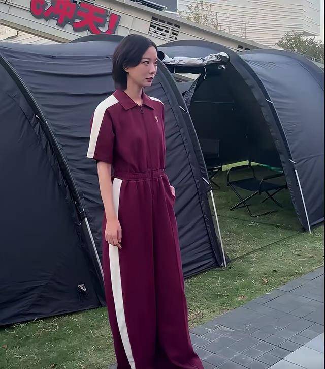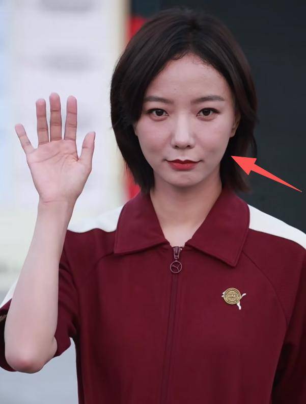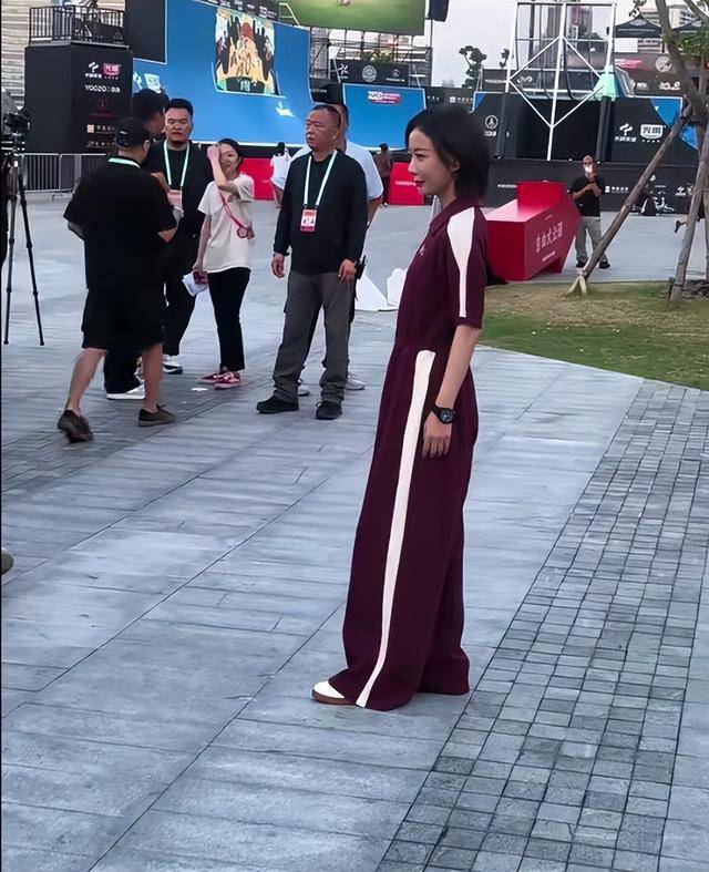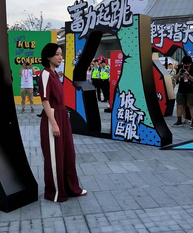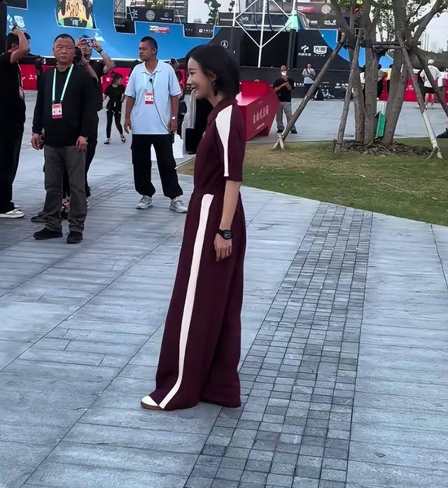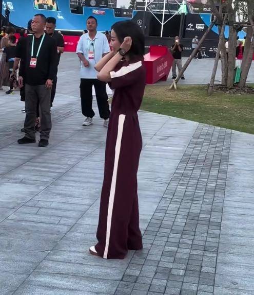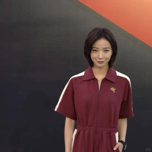 当天她选的造型也比较中性,身穿酒红色拼色运动装,再配上一头短发,显得好干练。