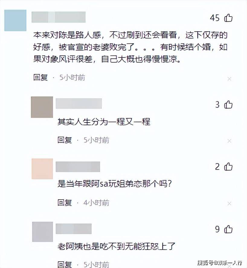 甚至还有网友表示,本来对陈是路人感,不过刷到还会看看,这下仅存的好感,被官宣的老婆败完了,有时候结个婚,如果对象风评很差,自己大概也得慢慢凉。