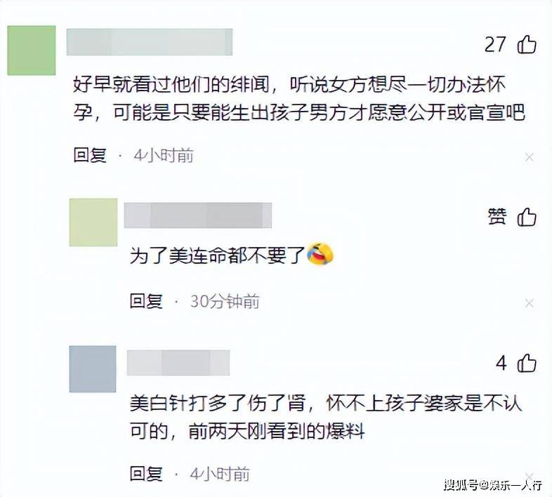 而且还有网友直接揣测称,好早就看过他们的绯闻,听说女方想尽一切办法怀孕,可能是只要能生出孩子男方才愿意公开或官宣吧。