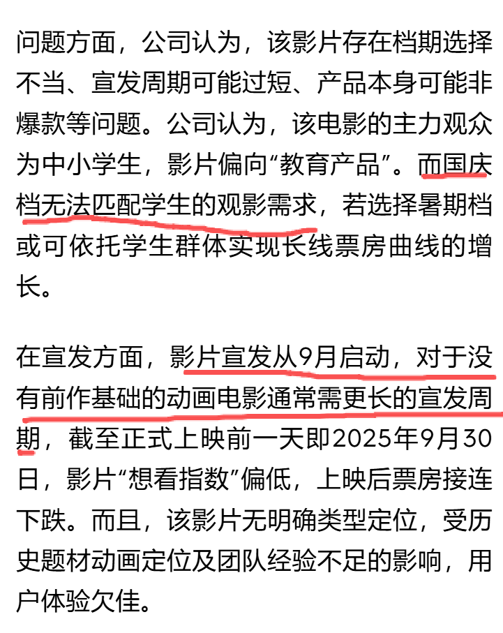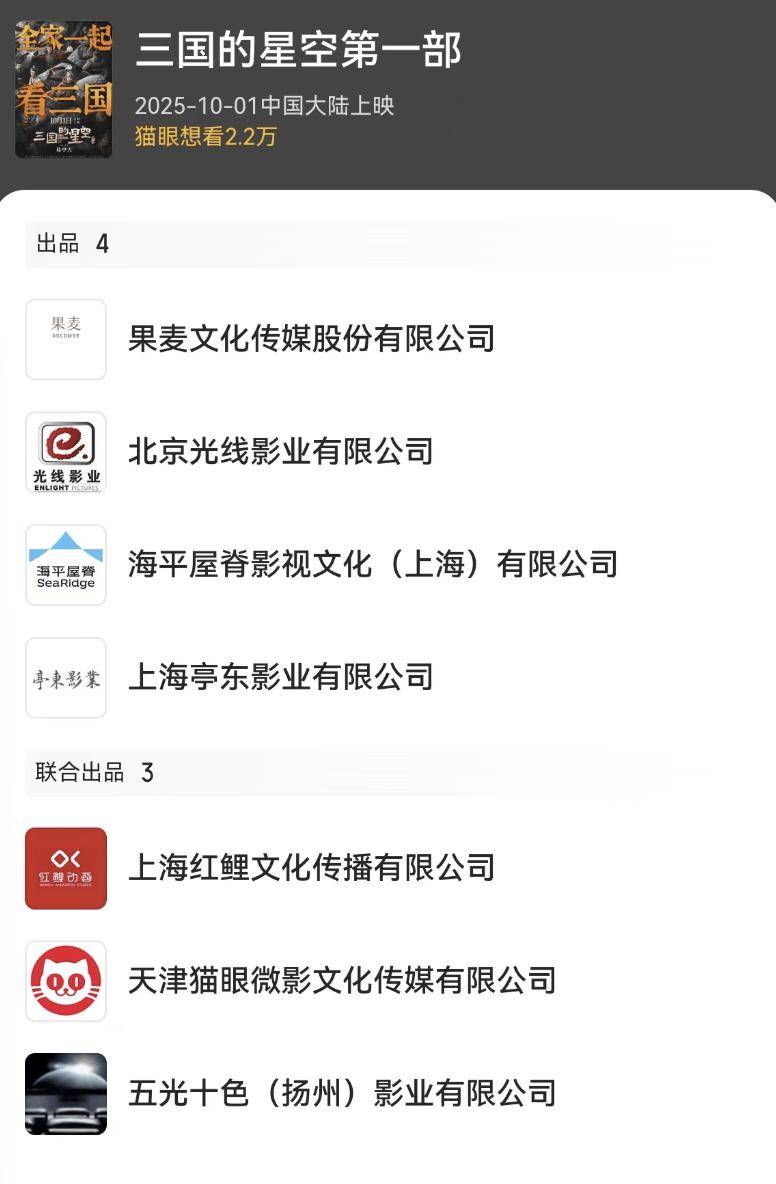 对于票房不及预期,果麦文化归咎于客观原因,档期选择不当、宣发周期过短、产品本身非爆款。《三国的星空》主力观众是中小学生,影片偏向“教育产品”属性,而国庆档无法匹配学生的观影需求,如果选择暑期档可能会更好。