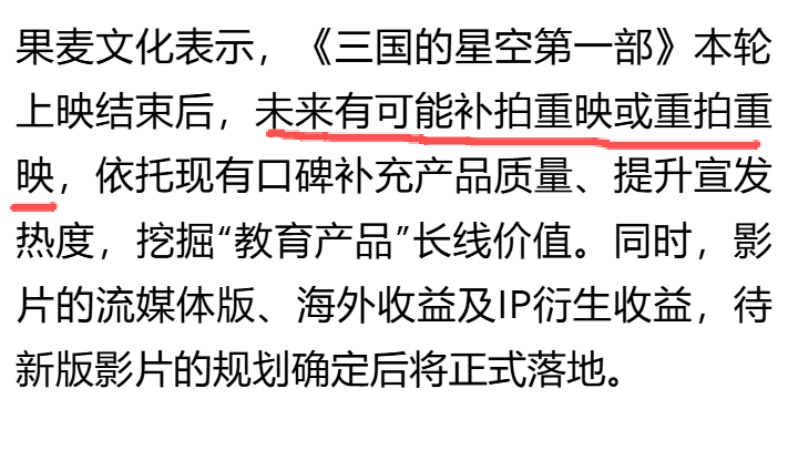 果麦文化表示,《三国的星空第一部》本轮上映结束后,未来有可能补拍重映或重拍重映,依托现有口碑补充产品质量、提升宣发热度,挖掘“教育产品”长线价值。同时,影片的流媒体版,海外收益及IP衍生收益,待新版影片的规划确定后将正式落地。