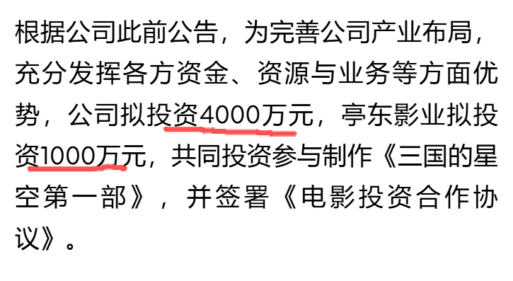 值得玩味的一组数字:此前果麦文化发公告透露,公司投资4000万元,韩寒的亭东影业投资1000万元,共同制作《三国的星空第一部》,并签署《电影投资合作协议》。