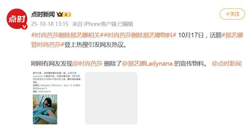 原创 时尚芭莎删除那艺娜物料,网友称其被“退货”