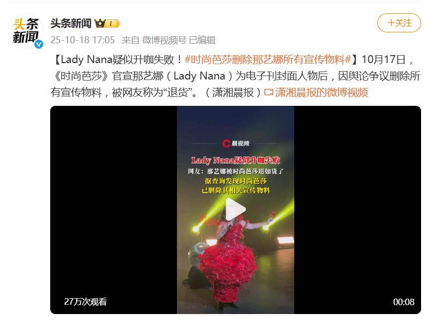 10月17日,时尚圈上演了一场“24小时极限反转剧”——《时尚芭莎》高调官宣那艺娜(Lady Nana)成为电子刊封面人物,话题 #那艺娜登时尚芭莎# 刚冲上热搜,短短一天内,所有宣传物料竟被全面删除,微博、电子刊预告消失得干干净净。这波操作被网友戏称为“时尚圈最快退货事件”,瞬间点燃舆论风暴。
