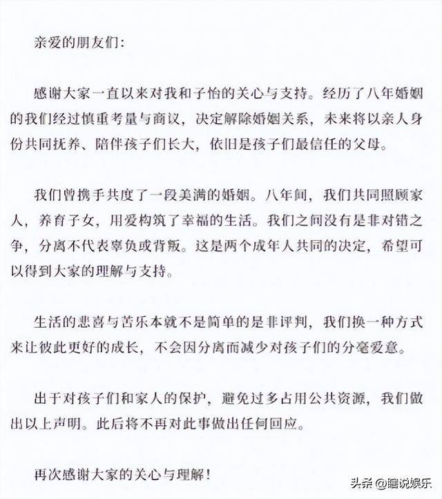 2023年10月,这两人突然发了离婚声明,表示“会以亲人身份一起照顾孩子”。
