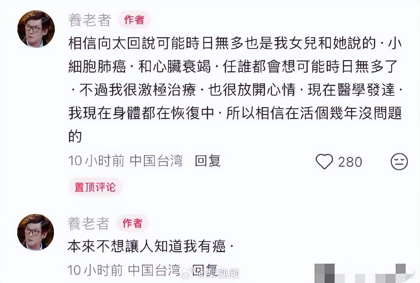 郭父表示相信向太会说可能时日不多,也是他女儿和向太说的,小细胞肺癌和心脏衰竭,任谁都会想可能时日不多了,不过很积极治疗,也很放开心情,现在医学发达,他现在身体都在恢复中,所以相信再活几年没问题。