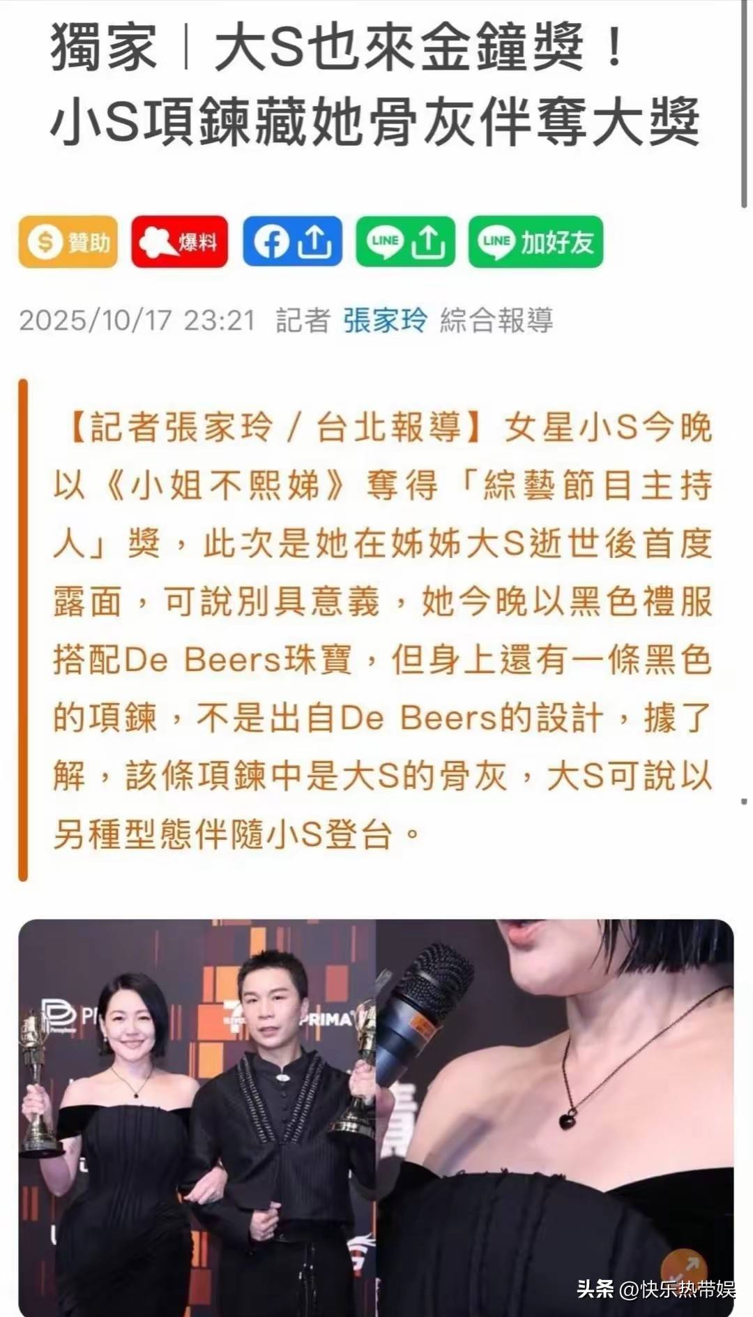 想想也是,这个节目是大s当年为她量身定做,那个时候小s因为失去内地市场,整天精神萎靡,为了让妹妹开心,她鼓励小s让她振作起来,于是才有了这个节目。大s还在的时候,她也有被提名,但是却没有拿奖,反而姐姐不在了,她却得到这个荣誉。