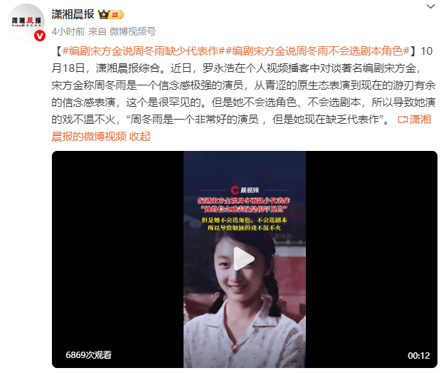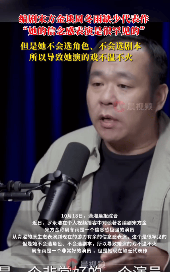 近日,罗永浩在个人视频播客中对谈著名编剧宋方金,宋方金称周冬雨是一个信念感极强的演员,从青涩的原生态表演到现在的游刃有余的信念感表演,这个是很罕见的。但是她不会选角色、不会选剧本,所以导致她演的戏不温不火,“周冬雨是一个非常好的演员,但是她现在缺乏代表作。”