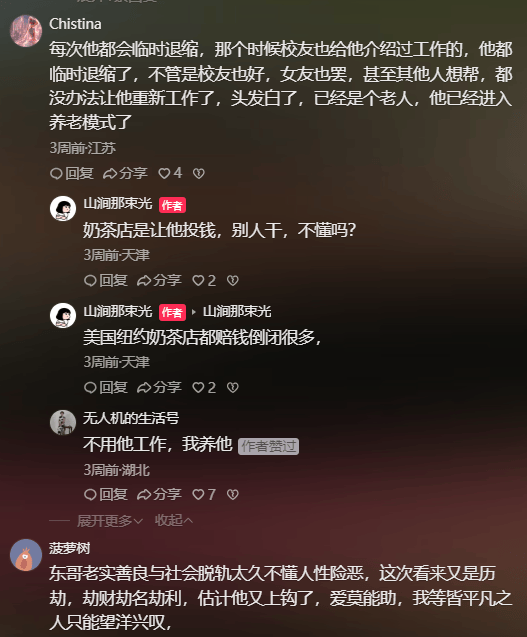 有网友听说这事后,留言称“每次他都会临时退缩,那个时候校友也给他介绍过工作的,他都临时退缩了,不管是校友也好,女友也罢,甚至其他人想帮,都没办法让他重新工作了,头发白了,已经是个老人,他已经进入养老模式了!